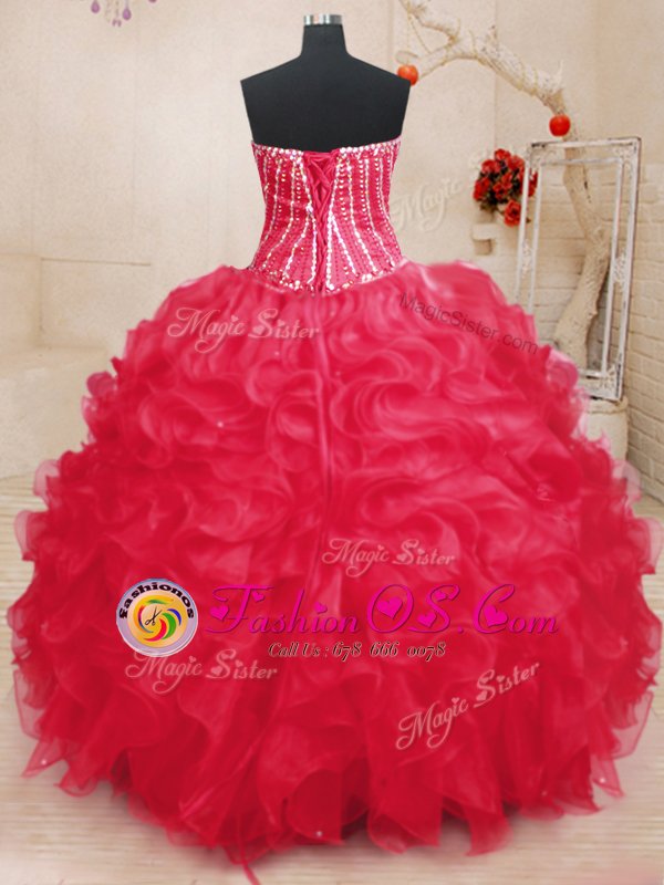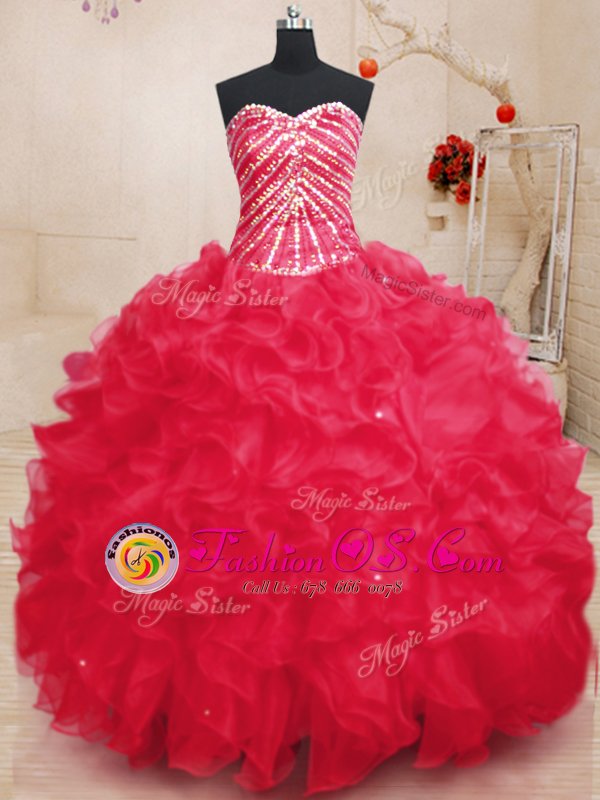 Chic Coral Red Organza Lace Up Sweet 16 Dresses Sleeveless Floor Length Beading and Ruffles and Sequins