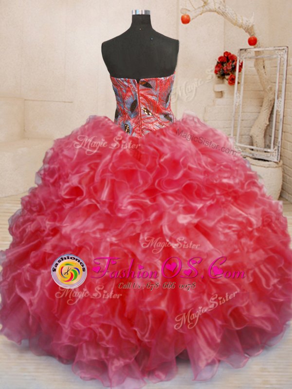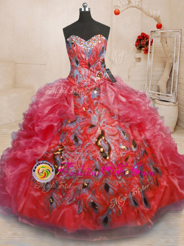 Sleeveless Floor Length Beading and Appliques and Ruffles Zipper Quinceanera Gowns with Red