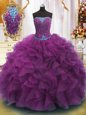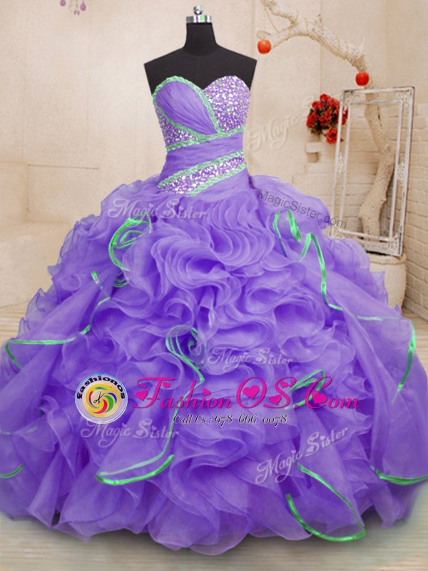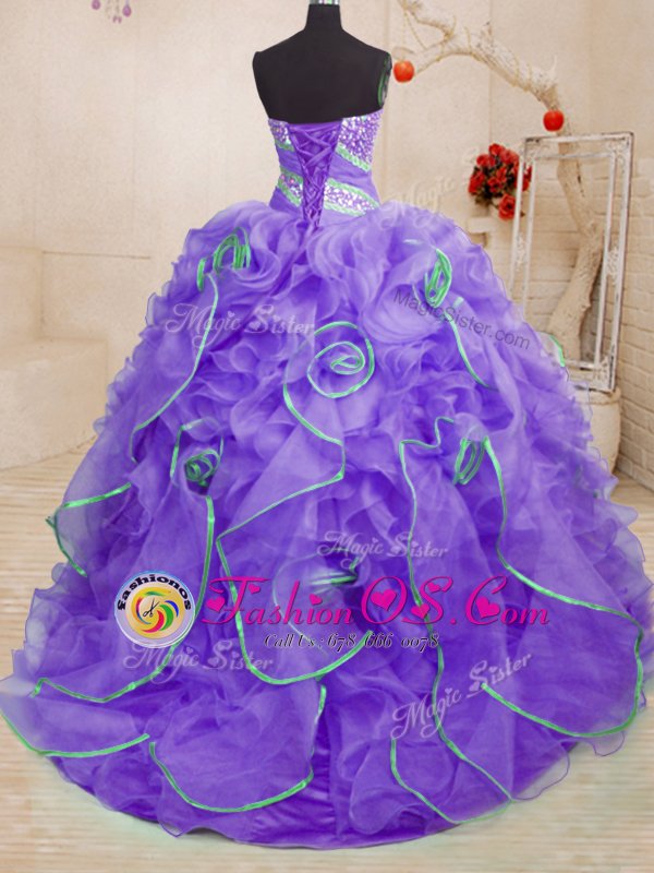 Lavender Ball Gowns Sweetheart Sleeveless Organza With Brush Train Lace Up Beading and Ruffles Vestidos de Quinceanera