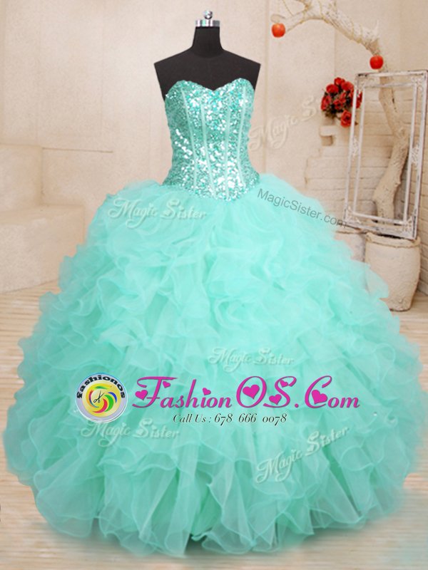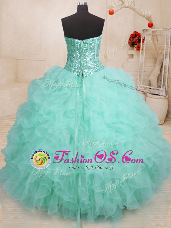 Classical Apple Green Ball Gowns Sweetheart Sleeveless Organza Floor Length Lace Up Beading and Ruffles Quince Ball Gowns