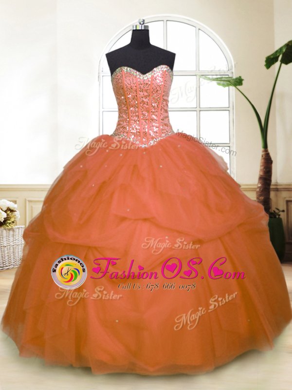 High End Orange Zipper Sweetheart Sequins and Pick Ups Quince Ball Gowns Tulle Sleeveless