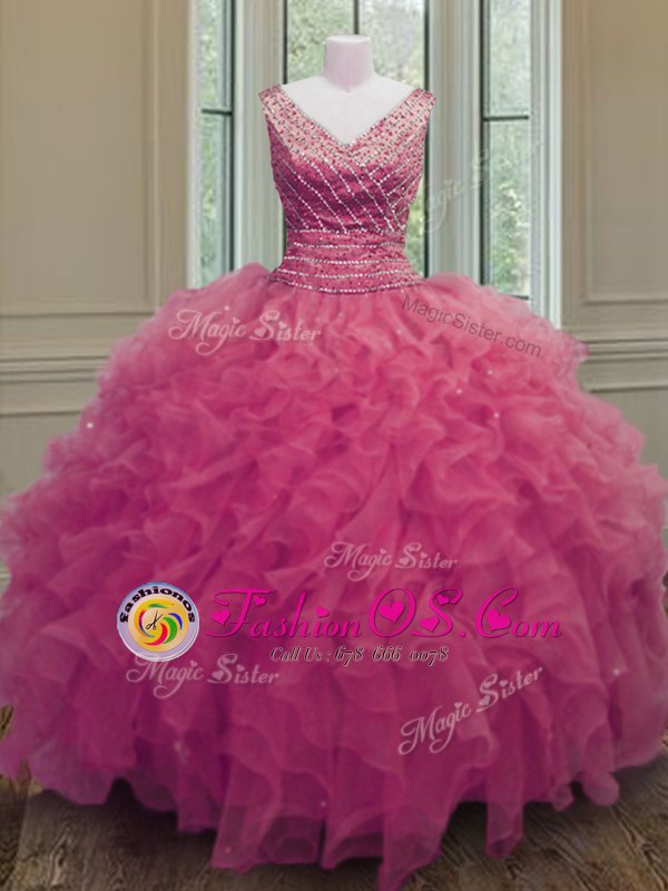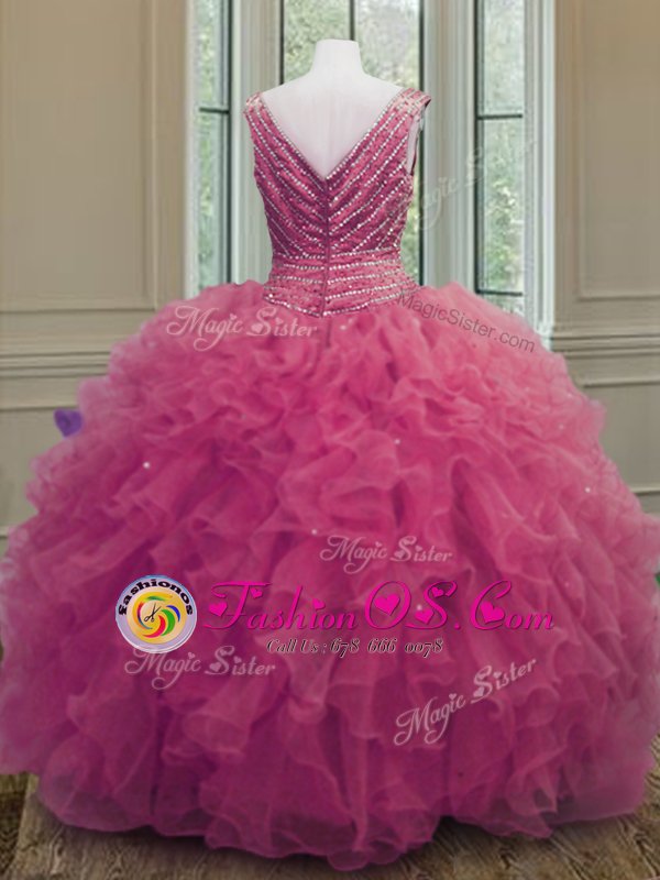 Enchanting Hot Pink Sleeveless Beading and Ruffles Floor Length Quinceanera Dresses