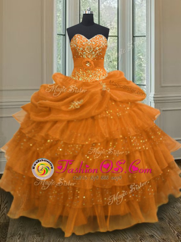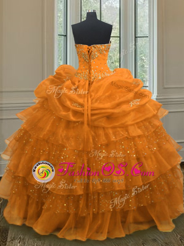 Orange Lace Up Quinceanera Gown Beading and Ruffled Layers and Pick Ups Sleeveless Floor Length