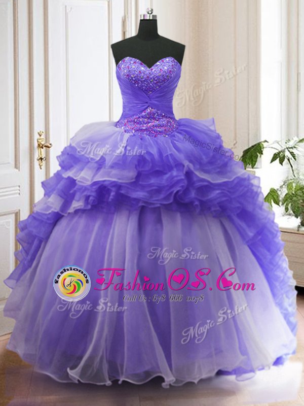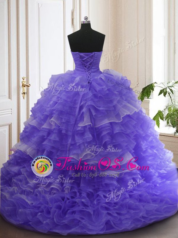 Sleeveless With Train Beading and Ruffled Layers Lace Up 15 Quinceanera Dress with Purple Sweep Train