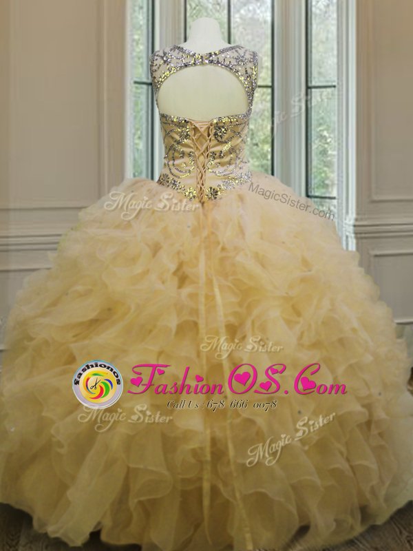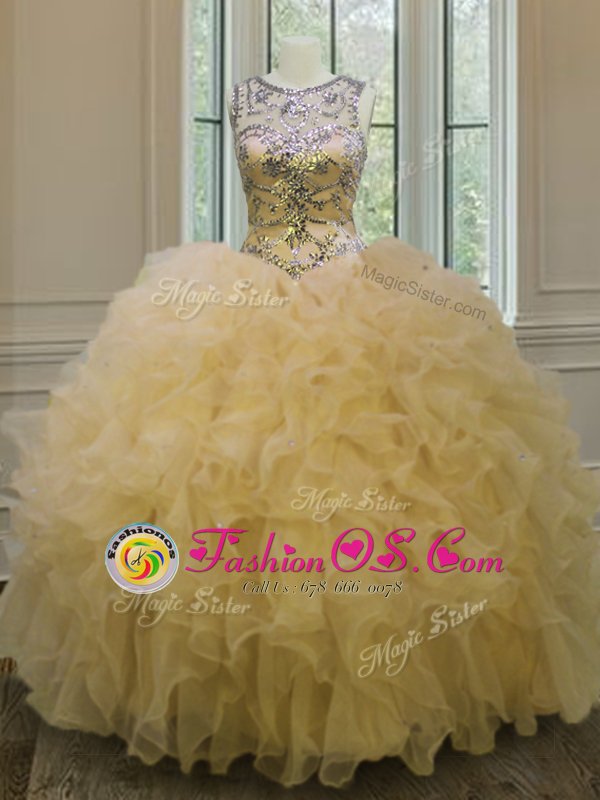 Scoop Clasp Handle Floor Length Blue Quince Ball Gowns Organza Sleeveless Beading and Lace and Ruffles