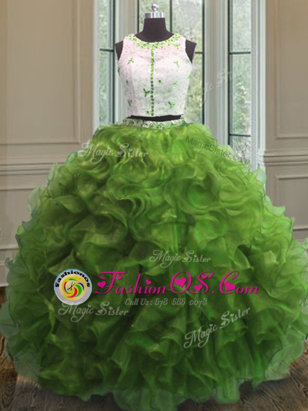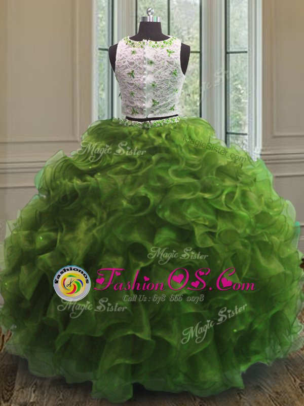 Colorful Green Ball Gowns Scoop Sleeveless Organza Floor Length Clasp Handle Appliques and Ruffles Quinceanera Dress