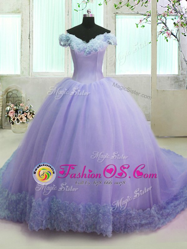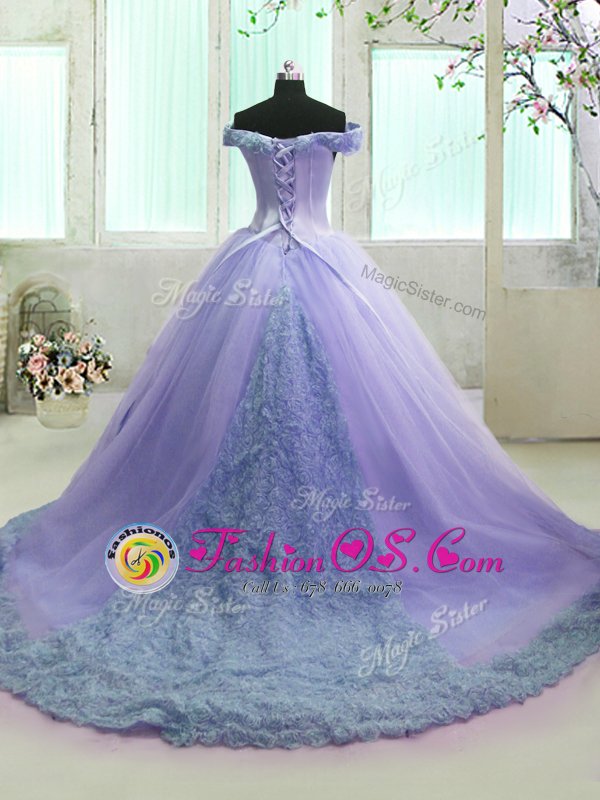 Elegant Off the Shoulder Hand Made Flower 15 Quinceanera Dress Lavender Lace Up Short Sleeves With Train Court Train