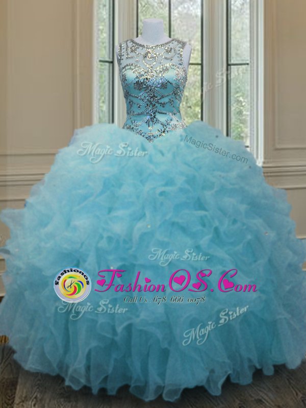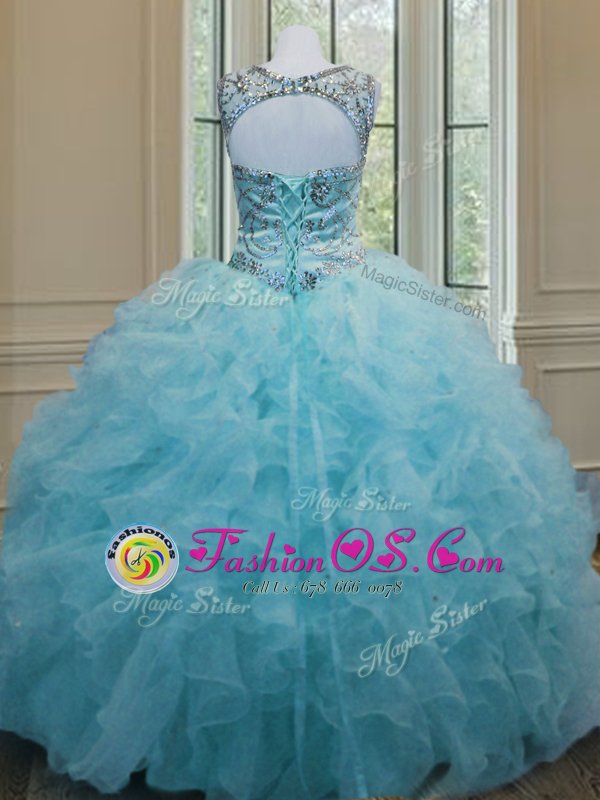 Scoop Sleeveless Organza Floor Length Lace Up Quince Ball Gowns in Aqua Blue for with Beading and Ruffles