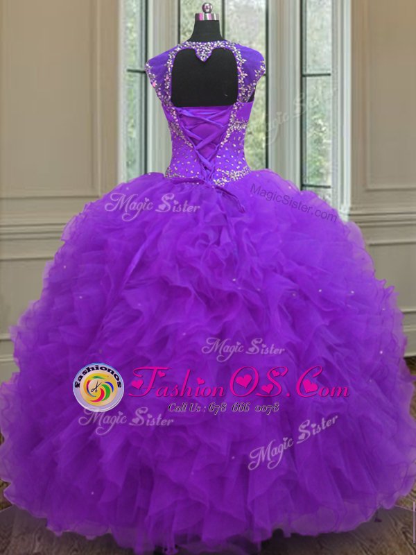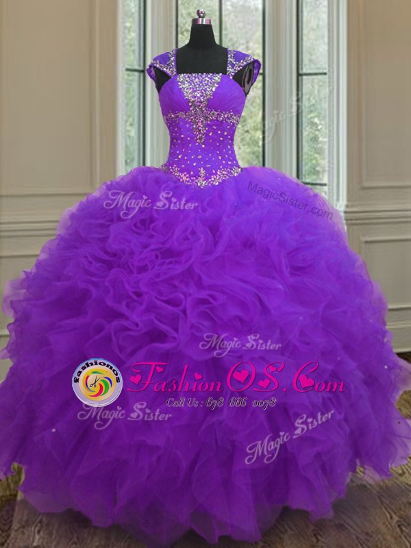 Purple Ball Gowns Straps Cap Sleeves Organza Floor Length Lace Up Beading and Ruffles and Sequins 15 Quinceanera Dress