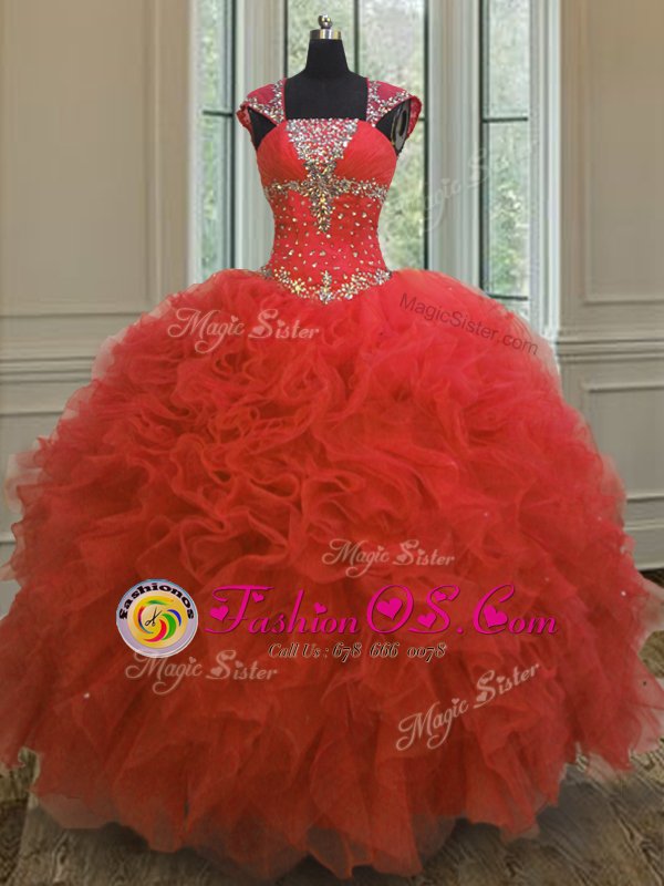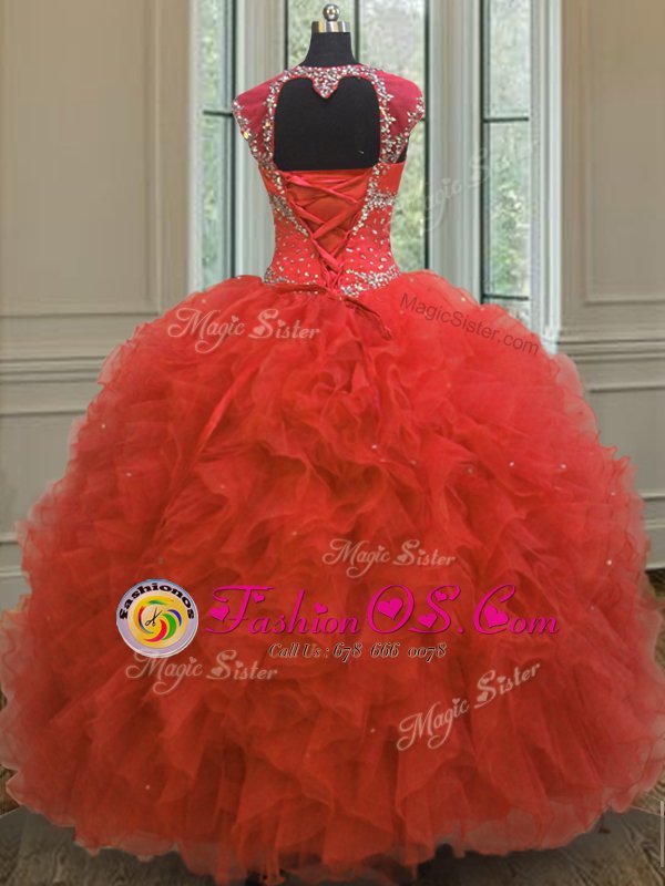 Artistic Straps Floor Length Coral Red 15th Birthday Dress Organza Cap Sleeves Beading and Ruffles and Sequins
