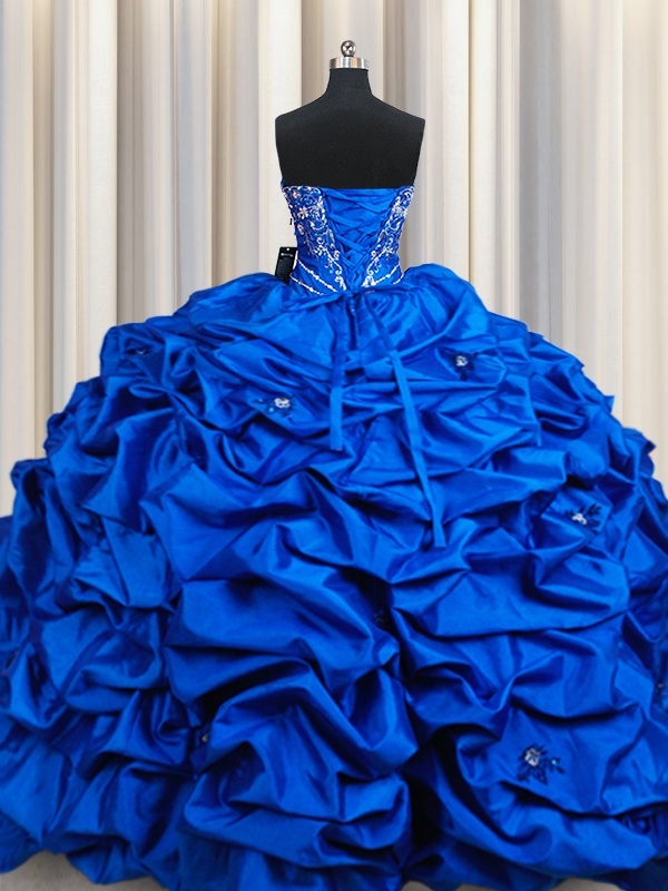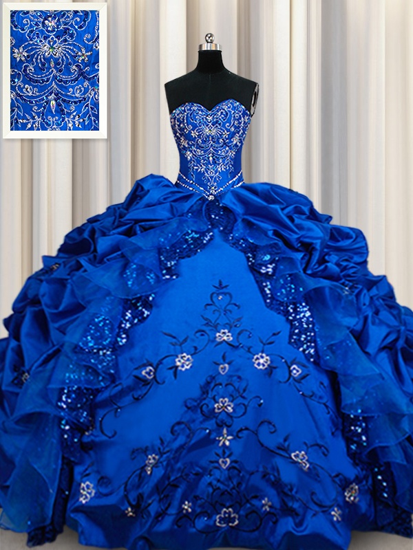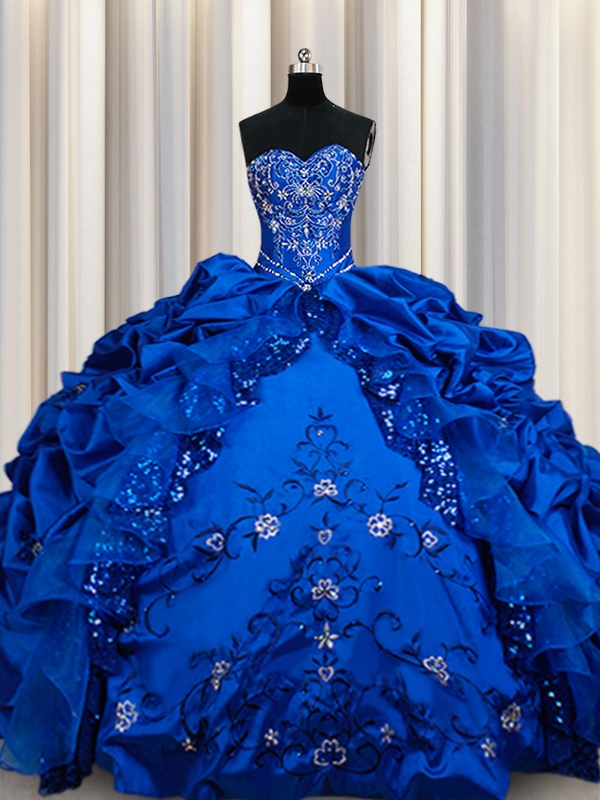 Great Sweetheart Sleeveless Quince Ball Gowns Floor Length Beading and Embroidery and Sequins and Pick Ups Royal Blue Taffeta