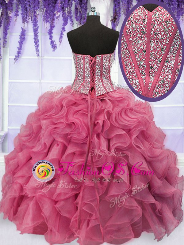 Stunning Coral Red Organza Lace Up Sweet 16 Dress Long Sleeves Floor Length Beading and Embroidery