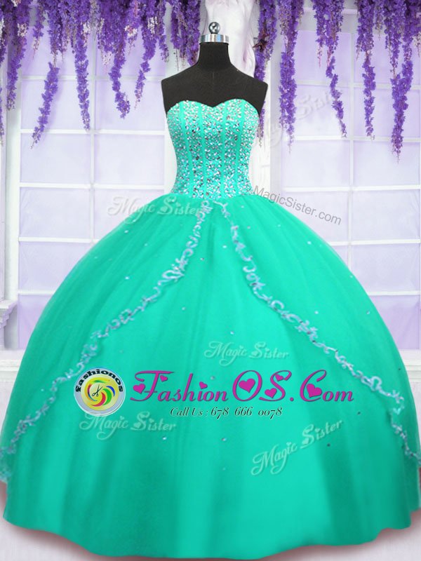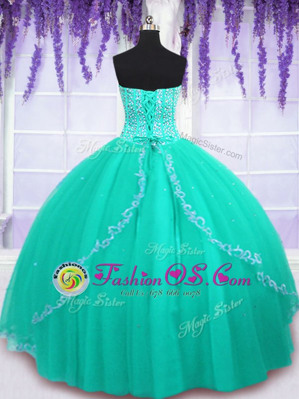High End Turquoise Tulle Lace Up Sweetheart Sleeveless Floor Length Sweet 16 Quinceanera Dress Beading and Sequins