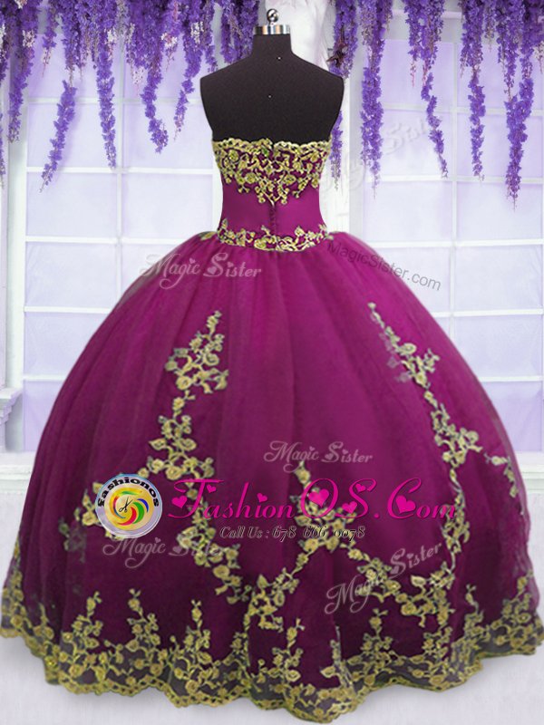 Deluxe Floor Length Zipper Vestidos de Quinceanera Fuchsia and In for Military Ball and Sweet 16 and Quinceanera with Appliques