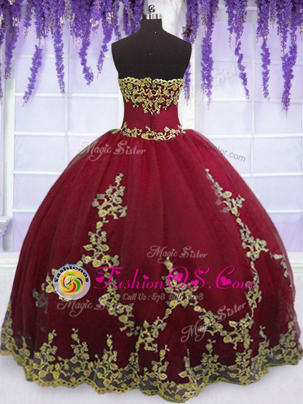 Hot Sale Red Ball Gowns Strapless Sleeveless Tulle Floor Length Zipper Appliques 15 Quinceanera Dress