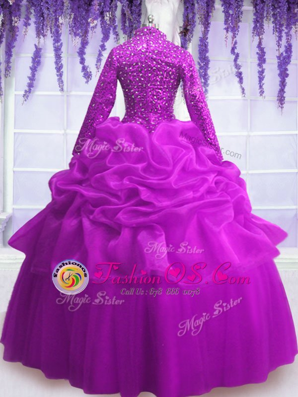 Best Organza V-neck Long Sleeves Zipper Sequins and Pick Ups Quinceanera Dresses in Fuchsia