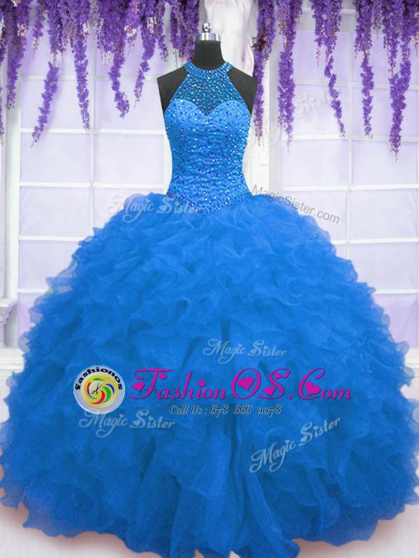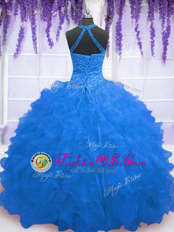 Fine Blue Organza Zipper Ball Gown Prom Dress Sleeveless Floor Length Beading and Ruffles