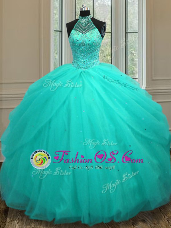 Halter Top Beading Quince Ball Gowns Aqua Blue Lace Up Sleeveless Floor Length