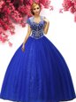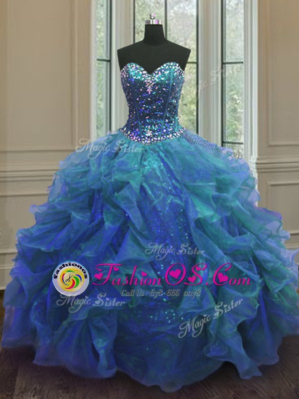Affordable Blue Organza and Sequined Lace Up Quince Ball Gowns Sleeveless Floor Length Beading and Ruffles