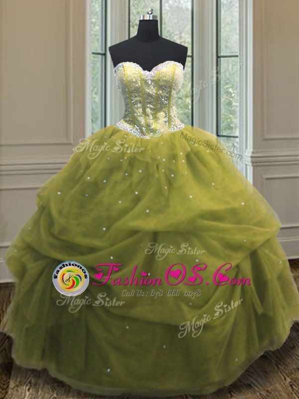 Olive Green Lace Up Quinceanera Gown Sequins and Pick Ups Sleeveless Floor Length
