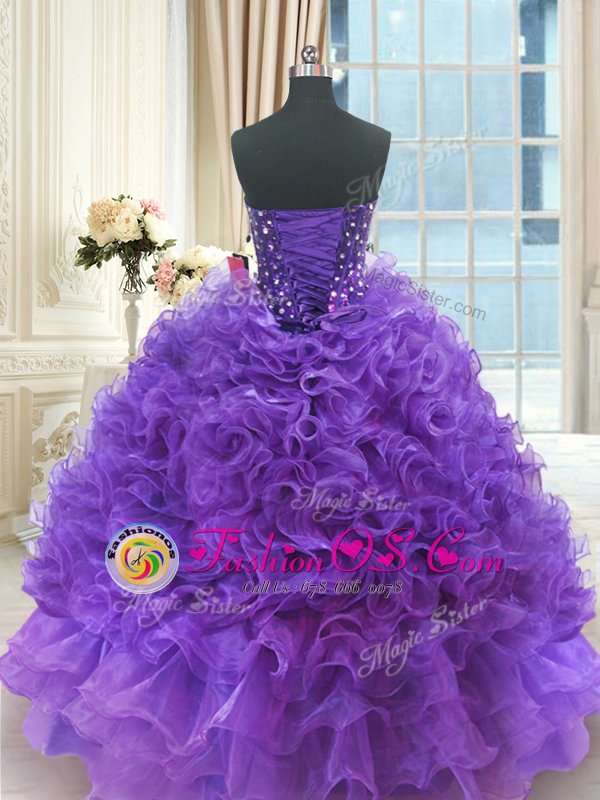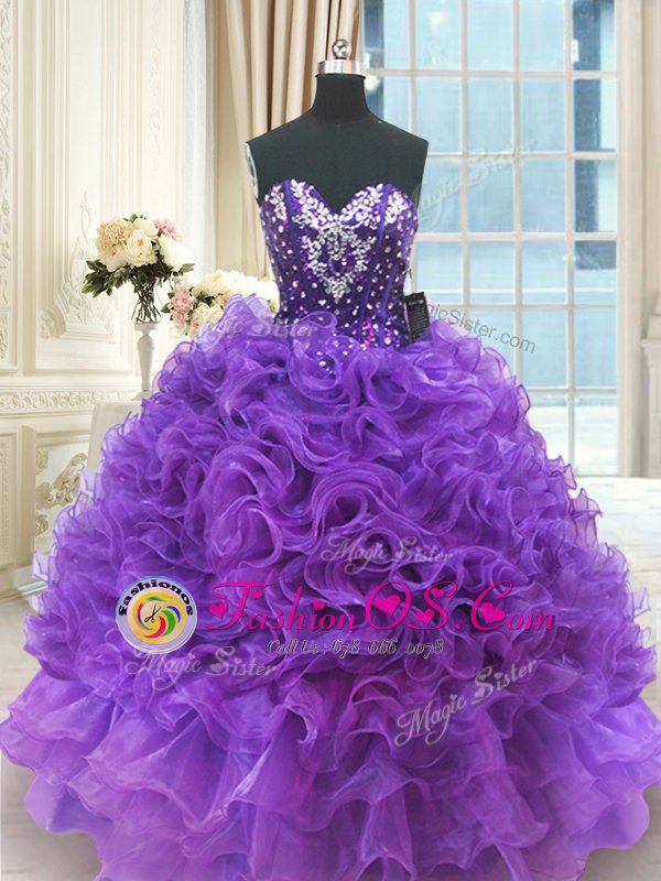 Gorgeous Purple Ball Gowns Sweetheart Sleeveless Organza Floor Length Lace Up Beading and Ruffles Quinceanera Dress