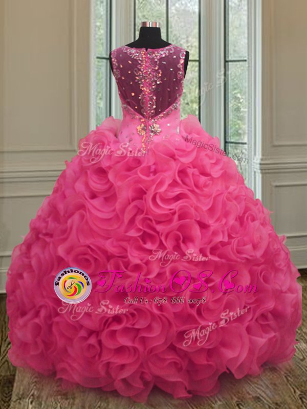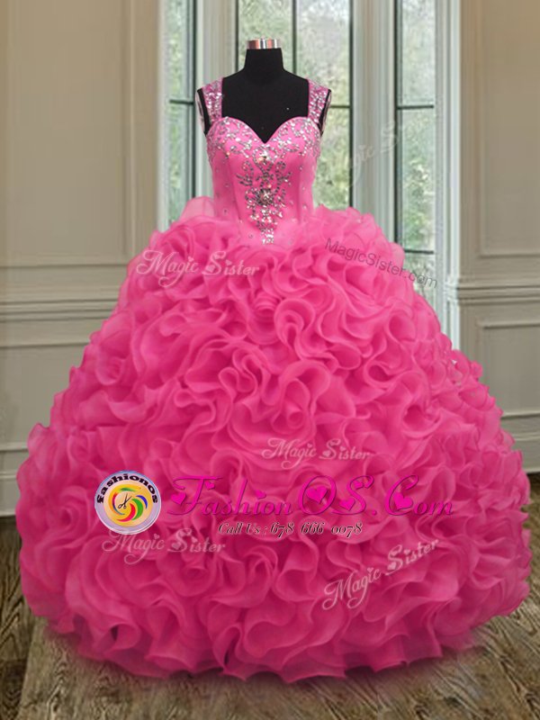 Straps Beading and Ruffles Ball Gown Prom Dress Hot Pink Zipper Sleeveless Floor Length
