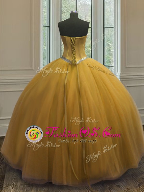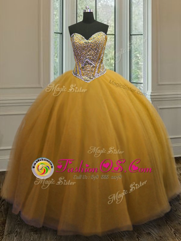 Romantic Gold Sleeveless Floor Length Beading Lace Up Sweet 16 Dresses