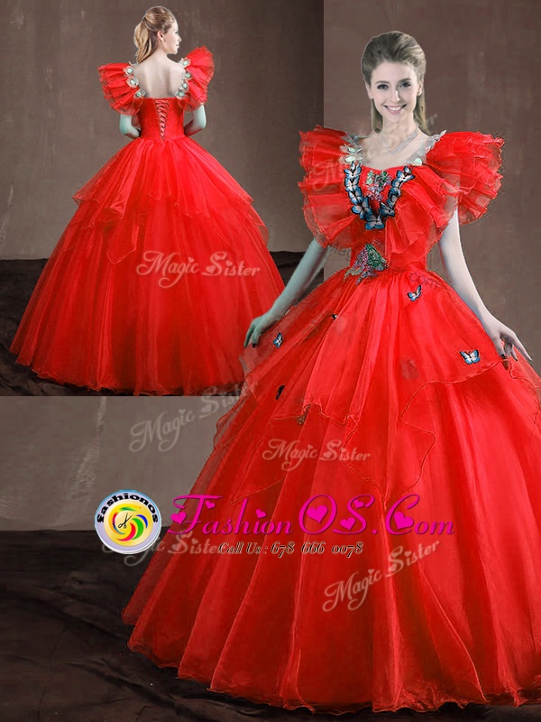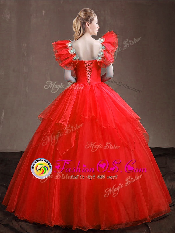 Coral Red V-neck Neckline Appliques and Belt Sweet 16 Quinceanera Dress Sleeveless Lace Up