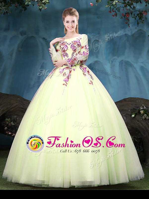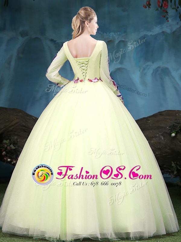 Scoop Yellow Green Long Sleeves Floor Length Appliques Lace Up Ball Gown Prom Dress