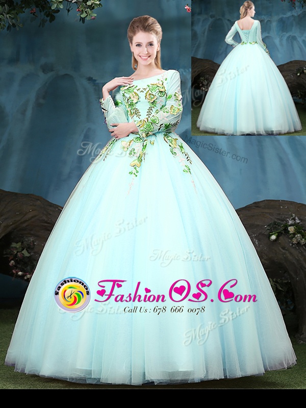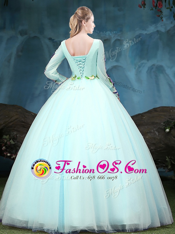 Simple Aqua Blue Quince Ball Gowns Military Ball and Sweet 16 and Quinceanera and For with Appliques Scoop Long Sleeves Lace Up