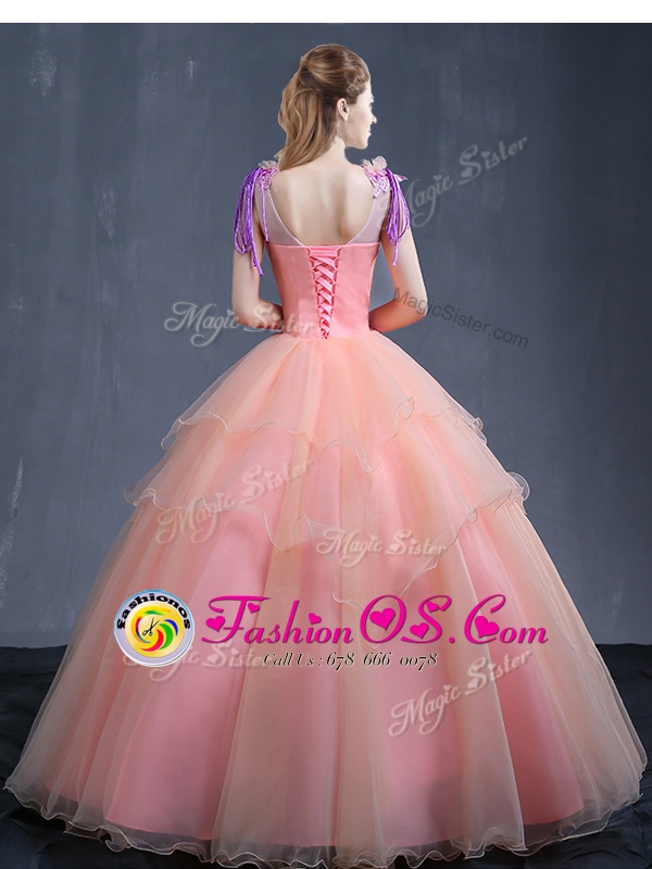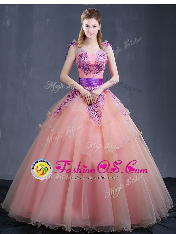 Simple Floor Length Watermelon Red Quince Ball Gowns V-neck Sleeveless Lace Up