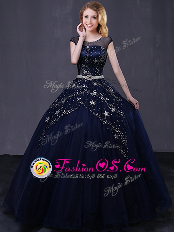 Captivating Scoop Cap Sleeves Vestidos de Quinceanera Floor Length Beading and Belt Navy Blue Tulle