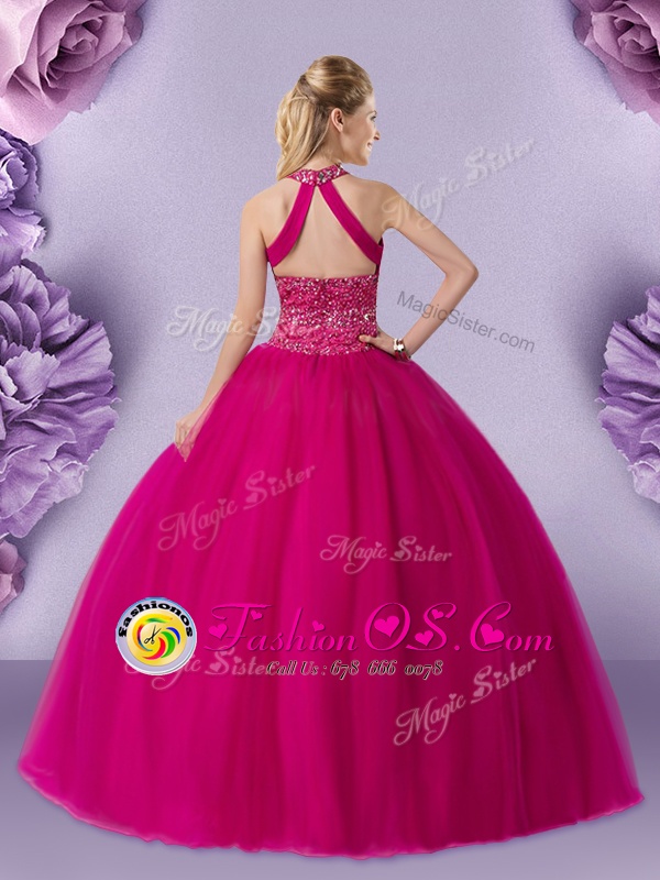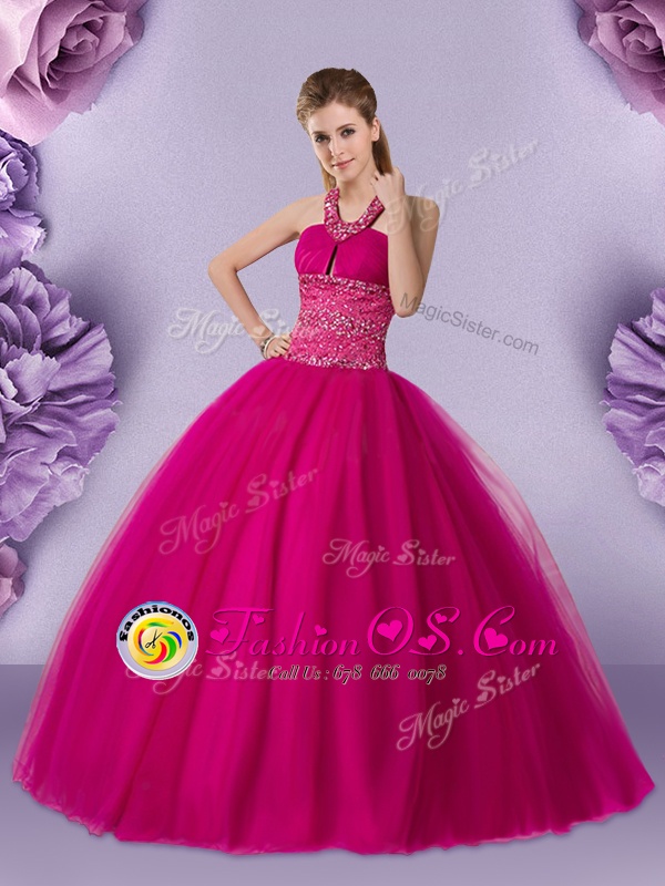 Beautiful Halter Top Floor Length Lace Up Sweet 16 Dress Fuchsia and In for Military Ball and Sweet 16 and Quinceanera with Beading