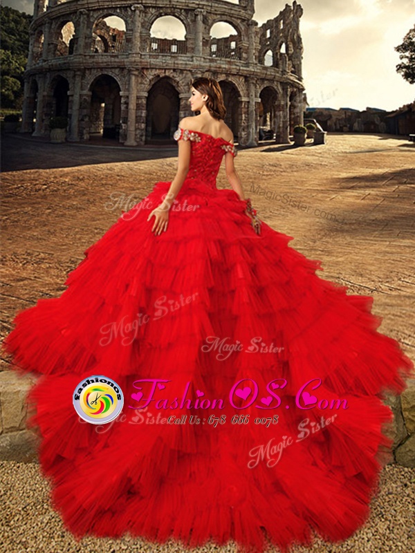 Captivating Off the Shoulder Sleeveless Tulle With Train Chapel Train Lace Up Sweet 16 Dress in Red with Beading and Ruffled Layers