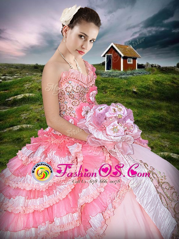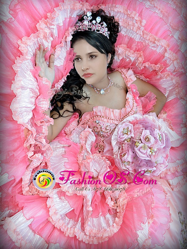 One Shoulder Sleeveless Floor Length Beading and Embroidery and Ruffled Layers Lace Up Quinceanera Gown with Pink And White