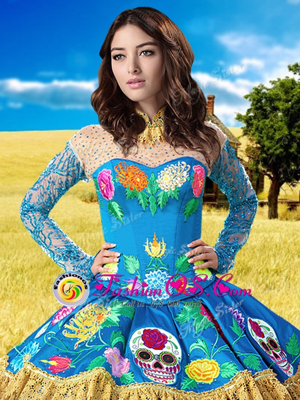 Blue High-neck Neckline Lace and Embroidery Sweet 16 Dresses Long Sleeves Lace Up