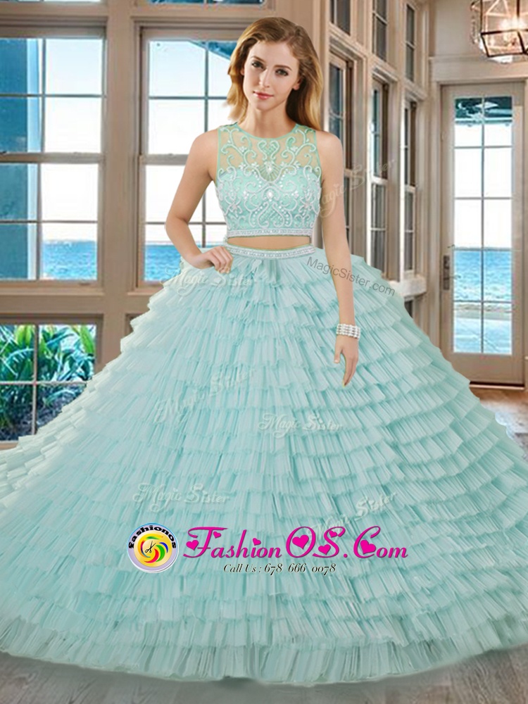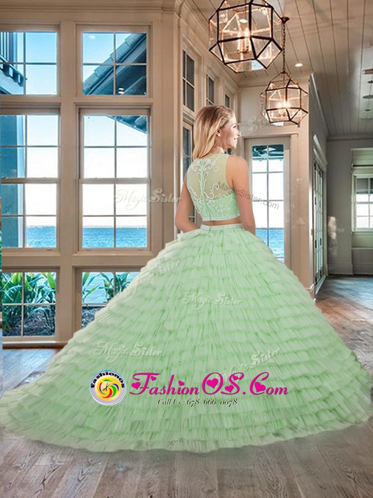 Designer Scoop Floor Length Apple Green Vestidos de Quinceanera Tulle Sleeveless Beading and Ruffled Layers