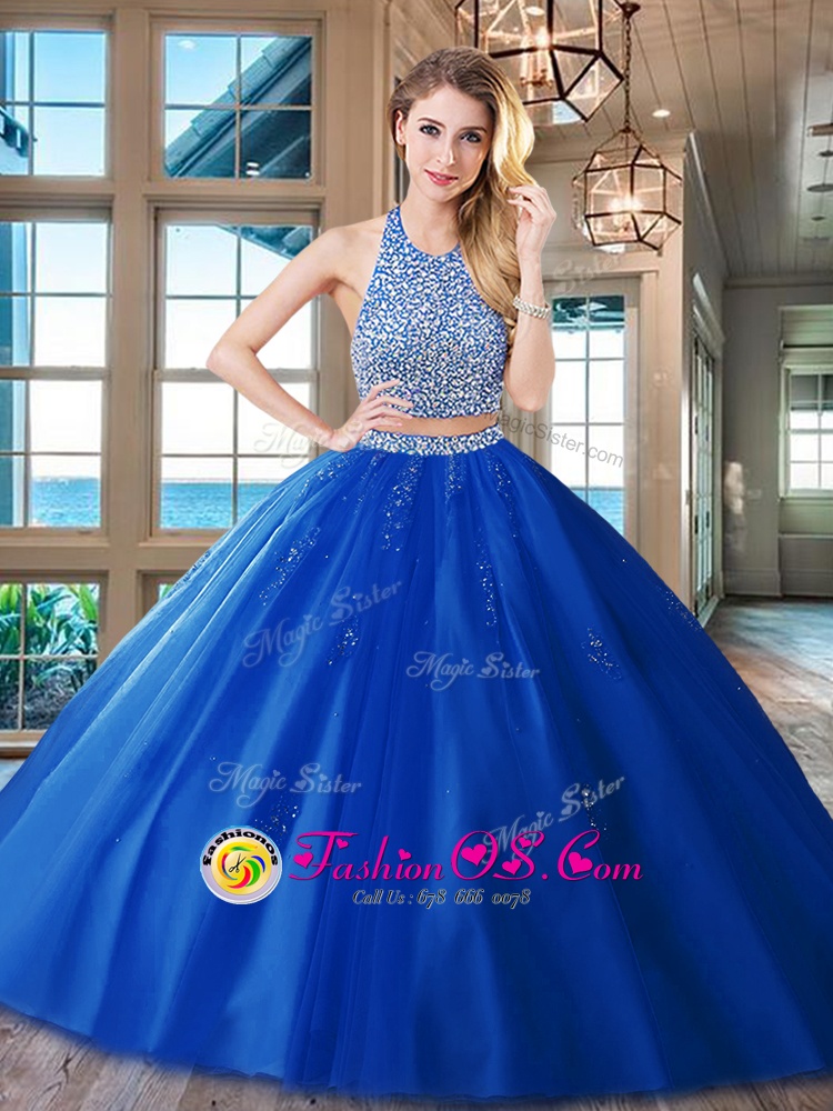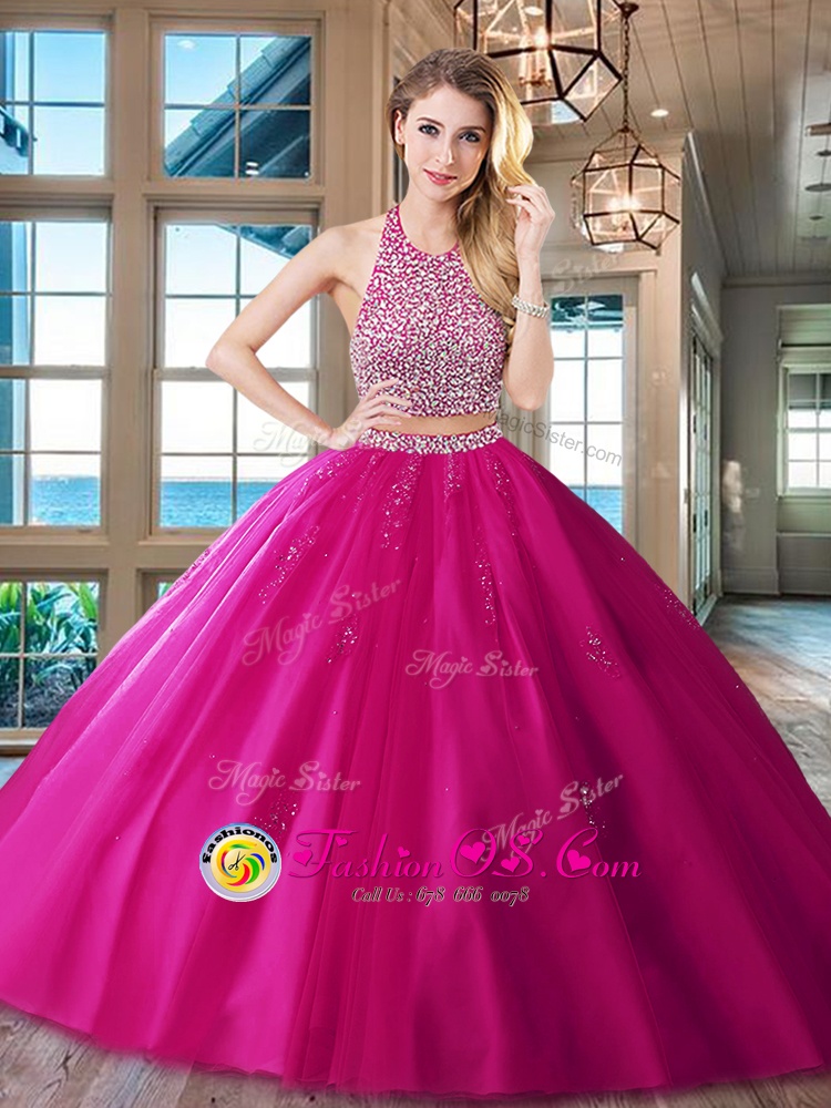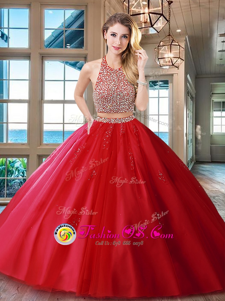 Custom Design Halter Top Red Two Pieces Beading and Appliques Quinceanera Gown Backless Tulle Sleeveless With Train