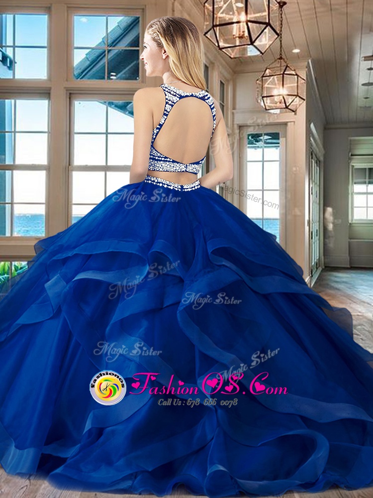 Sweet Fuchsia Sweet 16 Quinceanera Dress Military Ball and Sweet 16 and Quinceanera and For with Beading and Ruffles Scoop Sleeveless Brush Train Backless