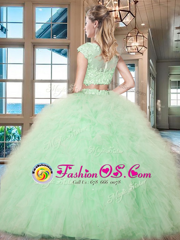 Clearance Lavender Tulle Zipper Scoop Cap Sleeves Floor Length Sweet 16 Dresses Beading and Appliques and Ruffles