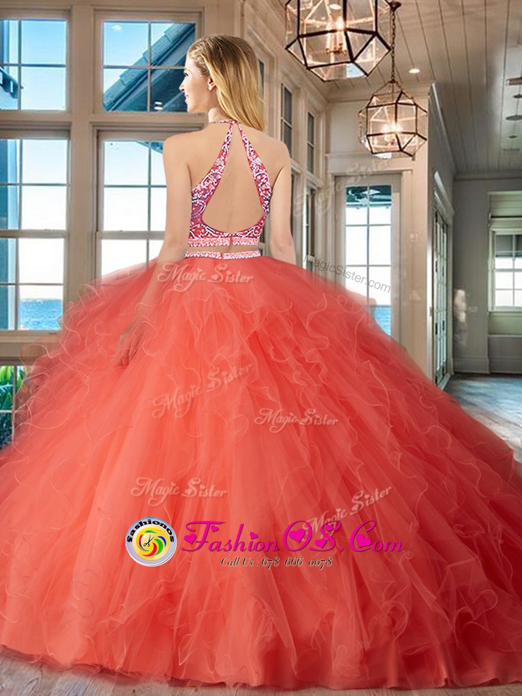 Noble Scoop Sleeveless Floor Length Beading and Ruffles Backless Vestidos de Quinceanera with Orange Red