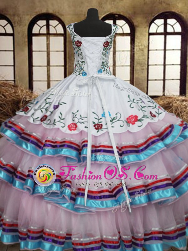 Ruffled Floor Length White Sweet 16 Dresses Straps Sleeveless Lace Up