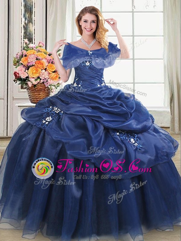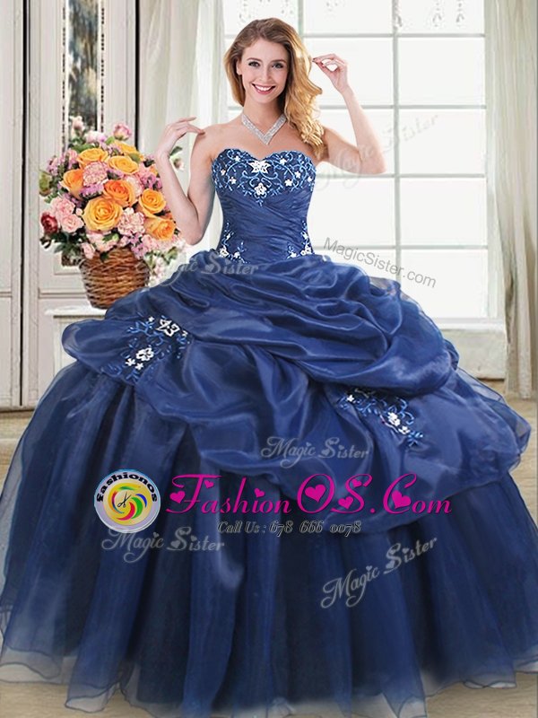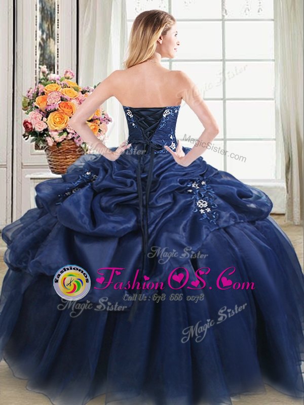Low Price Floor Length Navy Blue Quince Ball Gowns Organza Sleeveless Beading and Pick Ups