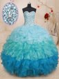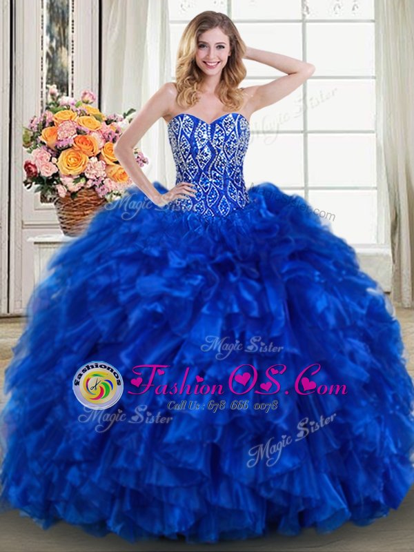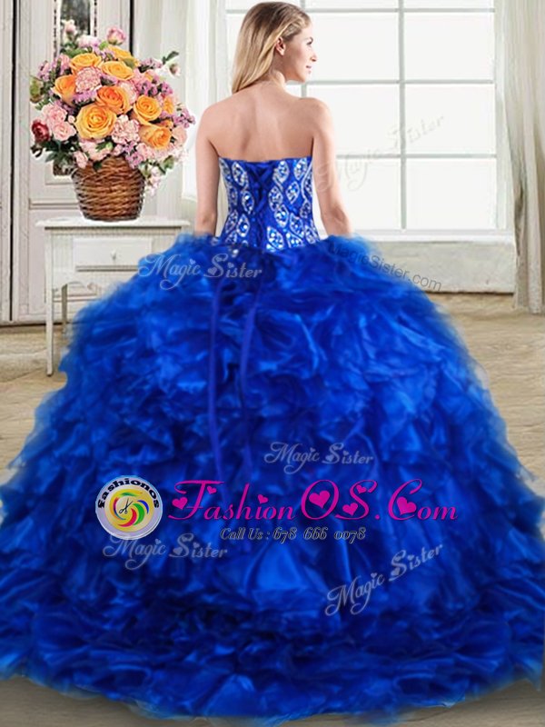 Royal Blue Ball Gowns Beading and Ruffles Quince Ball Gowns Lace Up Organza Sleeveless With Train