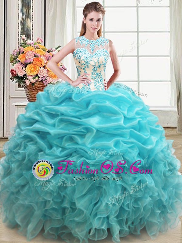 Scoop Aqua Blue Sleeveless Beading and Ruffles Floor Length Quinceanera Dress