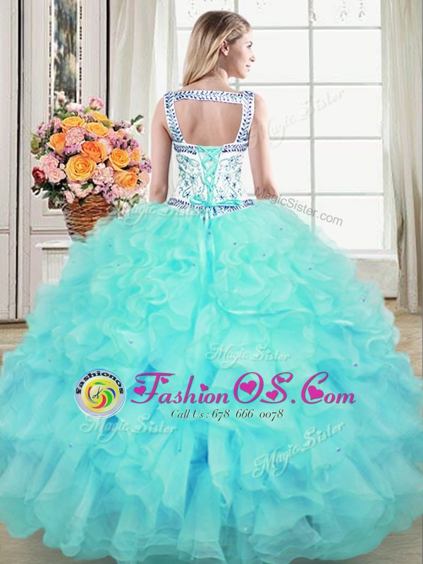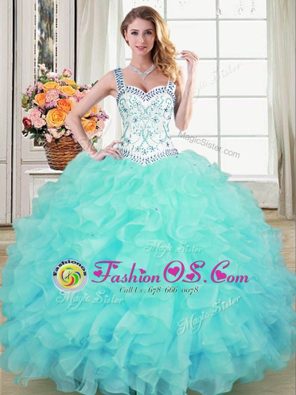 Glamorous Ball Gowns Quinceanera Dresses Aqua Blue Straps Organza Sleeveless Floor Length Lace Up