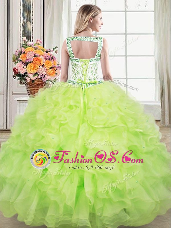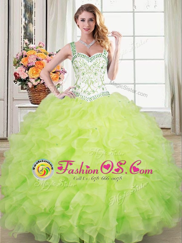 Decent Straps Yellow Green Lace Up Sweet 16 Dresses Beading and Lace and Ruffles Sleeveless Floor Length