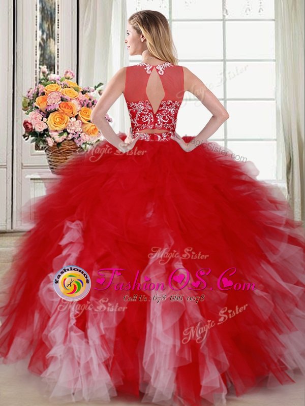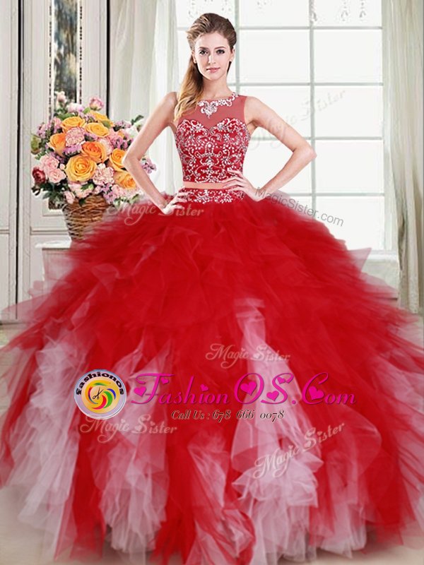 Beautiful Scoop Floor Length White and Red Sweet 16 Dress Tulle Sleeveless Beading and Ruffles