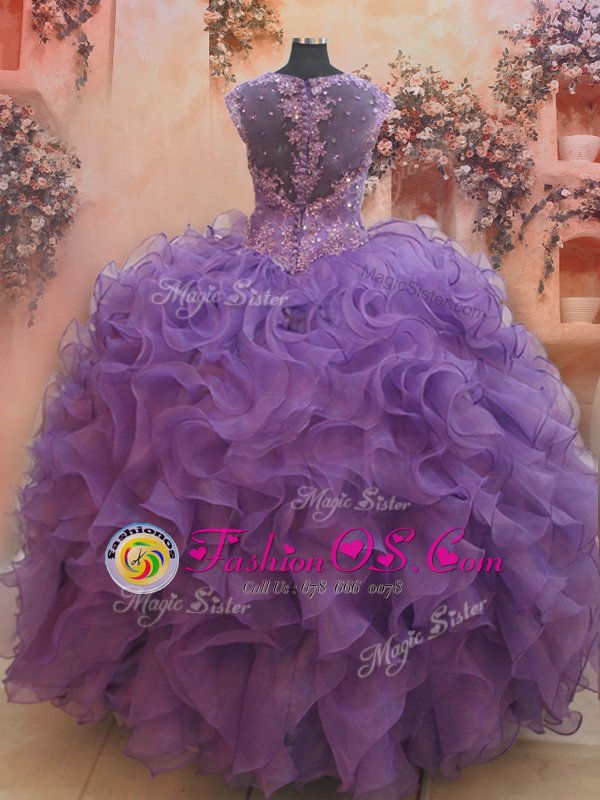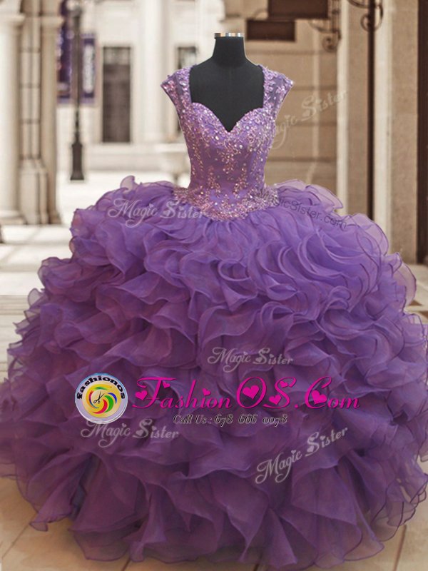 Straps Floor Length Eggplant Purple Quince Ball Gowns Organza Cap Sleeves Beading and Ruffles