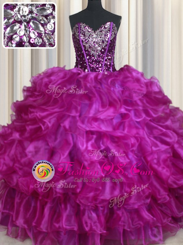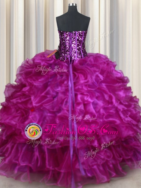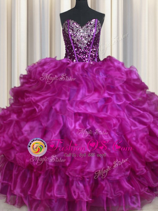 Graceful Sleeveless Organza Floor Length Lace Up Vestidos de Quinceanera in Purple for with Beading and Ruffles and Sequins